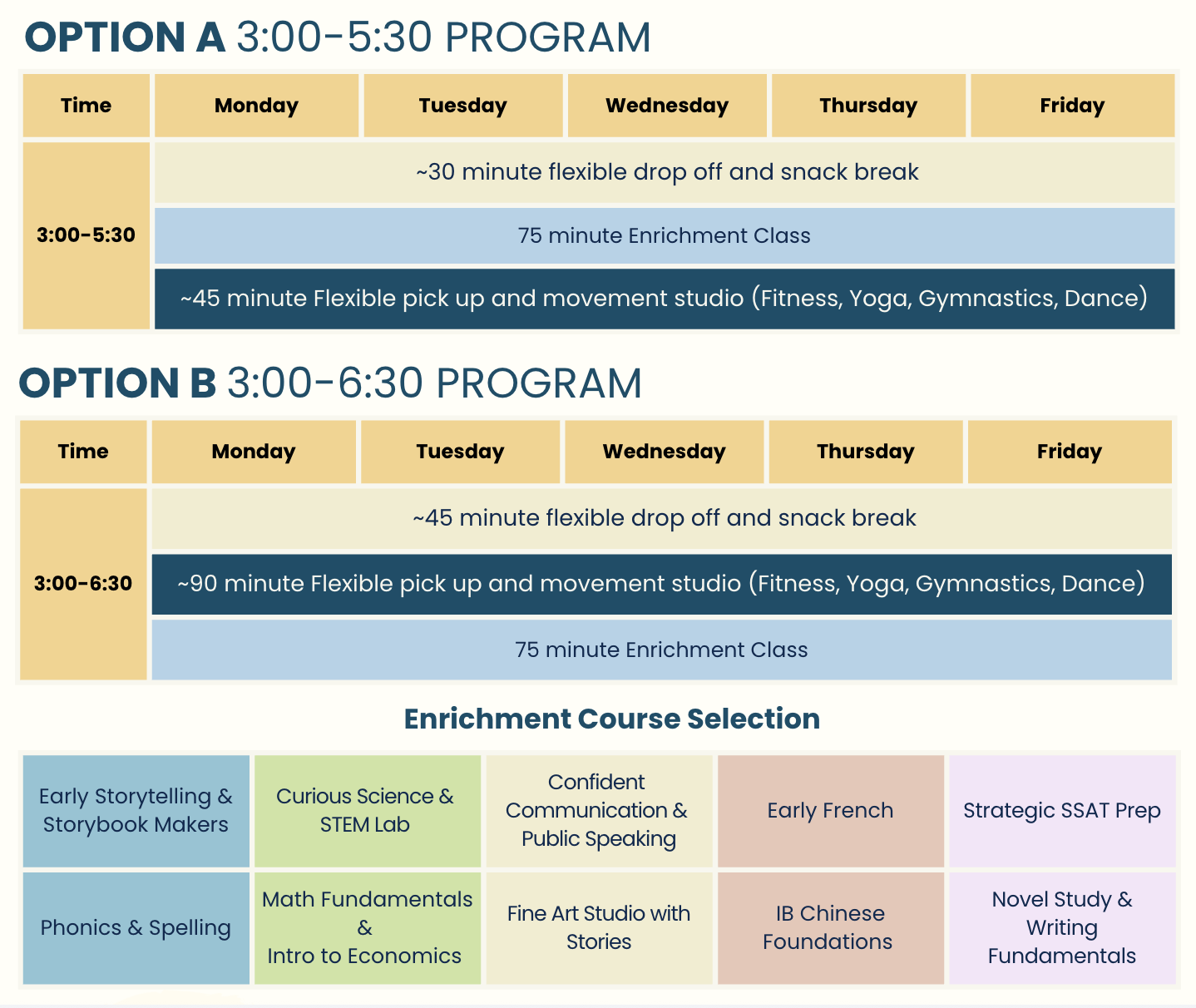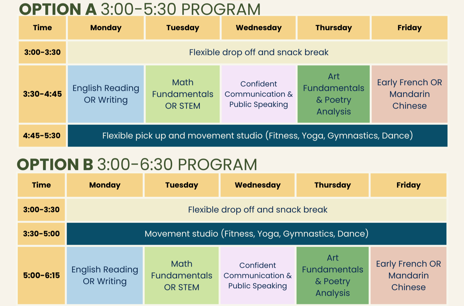 The program runs from Monday to Friday. Option A is from 3:00 – 5:30 PM and Option B is from 3:00-6:30PM.