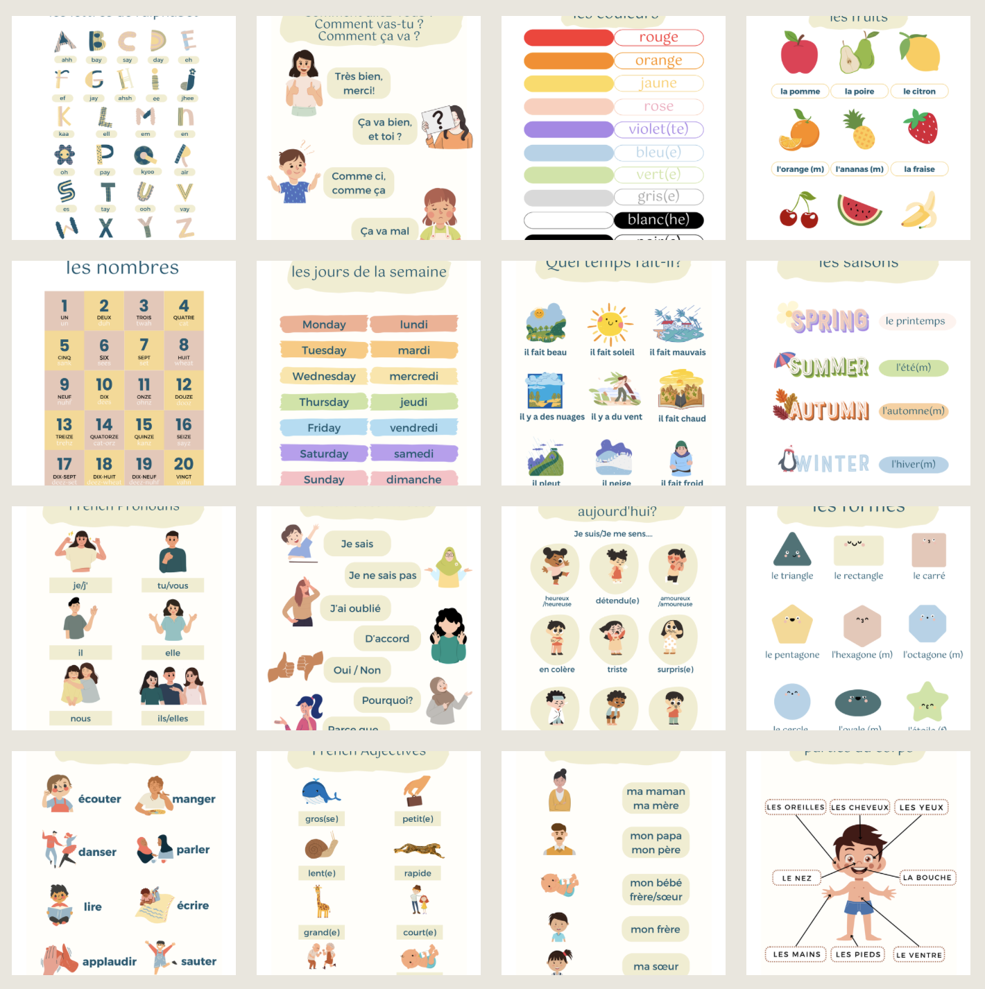 Introduce common French verbs to children. From "aller" (to go) to "manger" (to eat), these verbs will help children express actions and construct sentences.Adjectives: