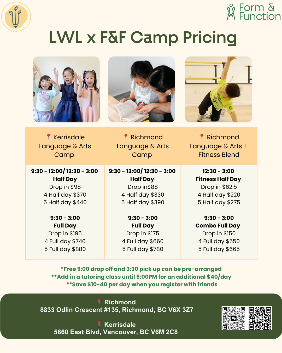 Available at our Richmond Campus, students can combine LWL’s Language & Arts camp with F&F’s Fitness and Wellness camp.