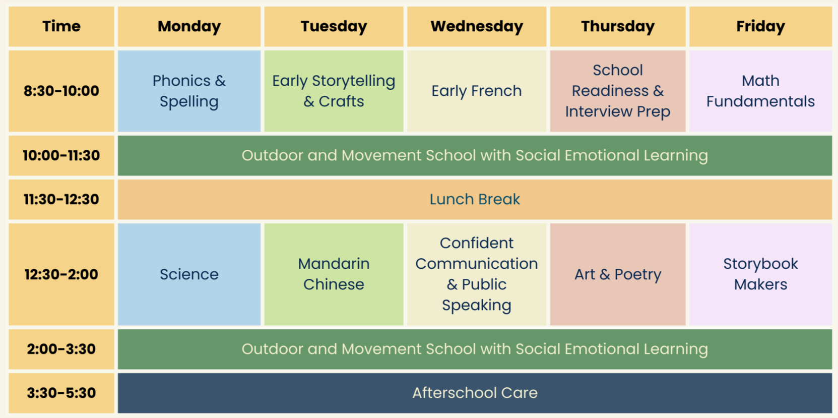 Each course is carefully designed to engage children in hands-on, interactive learning, promoting curiosity, focus, and confidence within a structured full-day rhythm. Please note we are not a daycare or preschool.