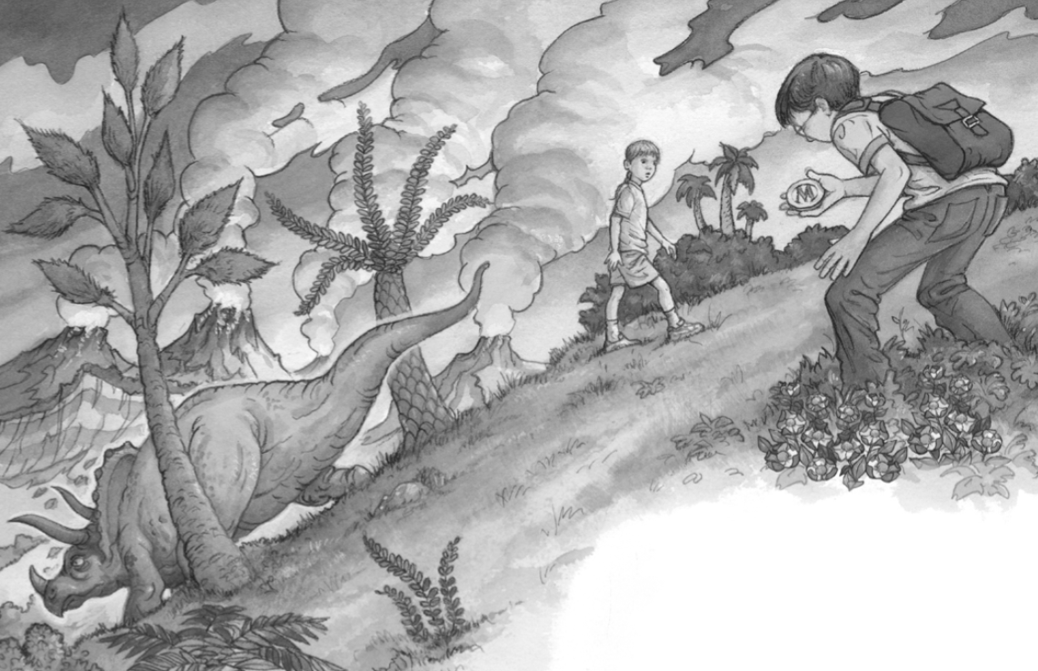 Annie and Jack discover a magical tree house full of books and are transported back to the Cretaceous period, where they observe dinosaurs and Jack finds a gold medallion engraved with “M.”