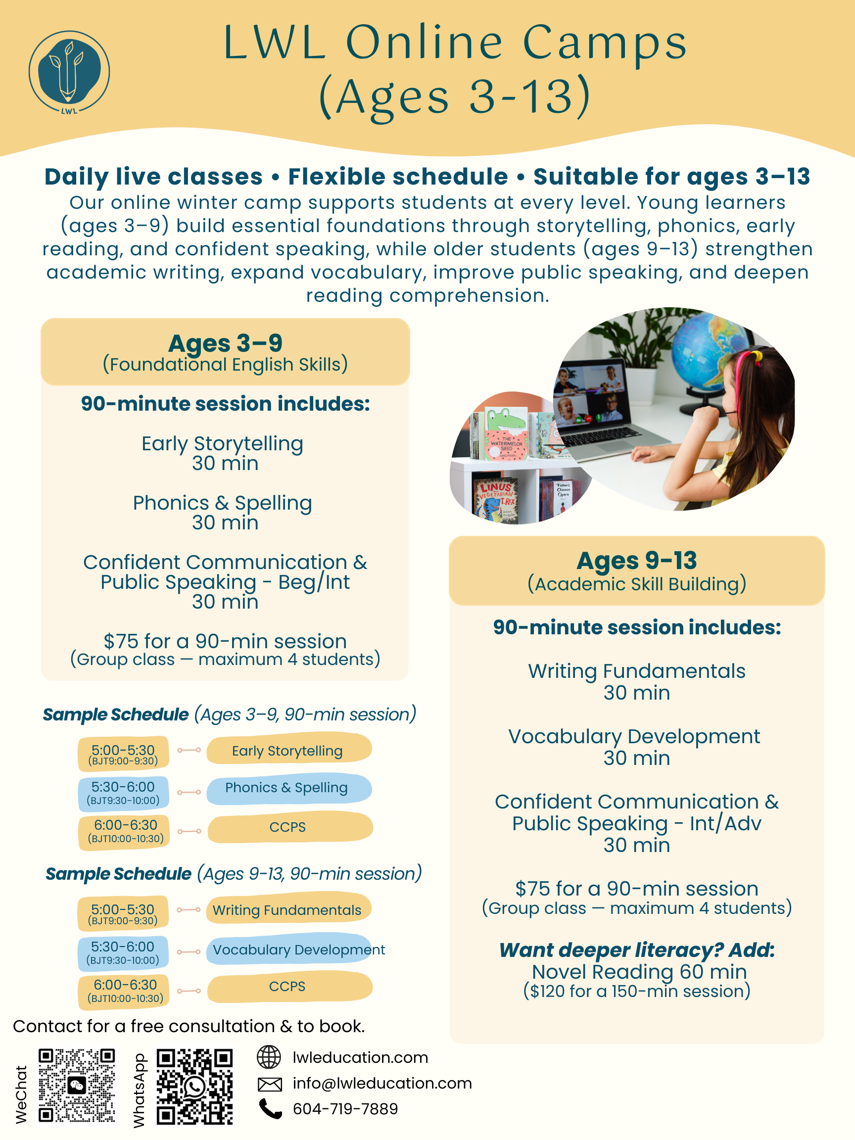 Elevate your child’s language and academic skills from the comfort of home with our dynamic LWL Online Camps. Designed for students aged 3–13 from around the world, our programs offer everything from Storytelling and Phonics for early learners to Academic Writing and Public Speaking for older students. With small class sizes (maximum 4 students) and a curriculum that builds confidence through interactive Zoom sessions, we ensure every student reaches their full potential.