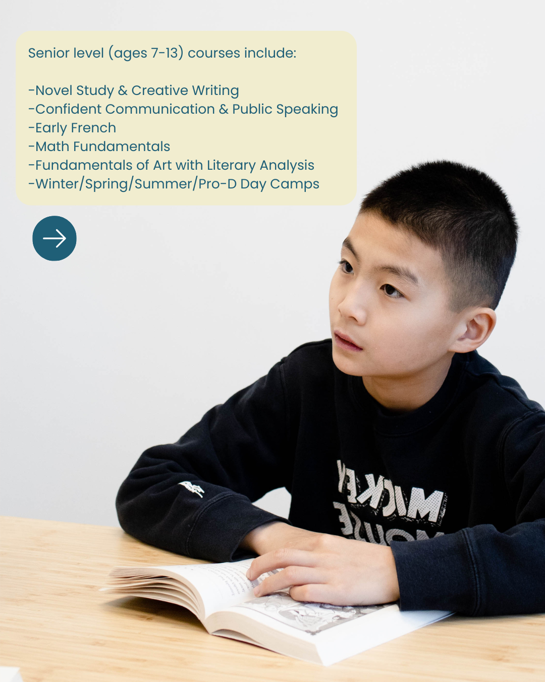 Early Storytelling, Phonics & Spelling, Early French, Confident Communication & Public Speaking, Novel Study & Creative Writing, Math Fundamentals, Fundamentals of Art with Literary Analysis, All About the Human Body: Anatomy & PhysiologyWeekday Daytime Hours: