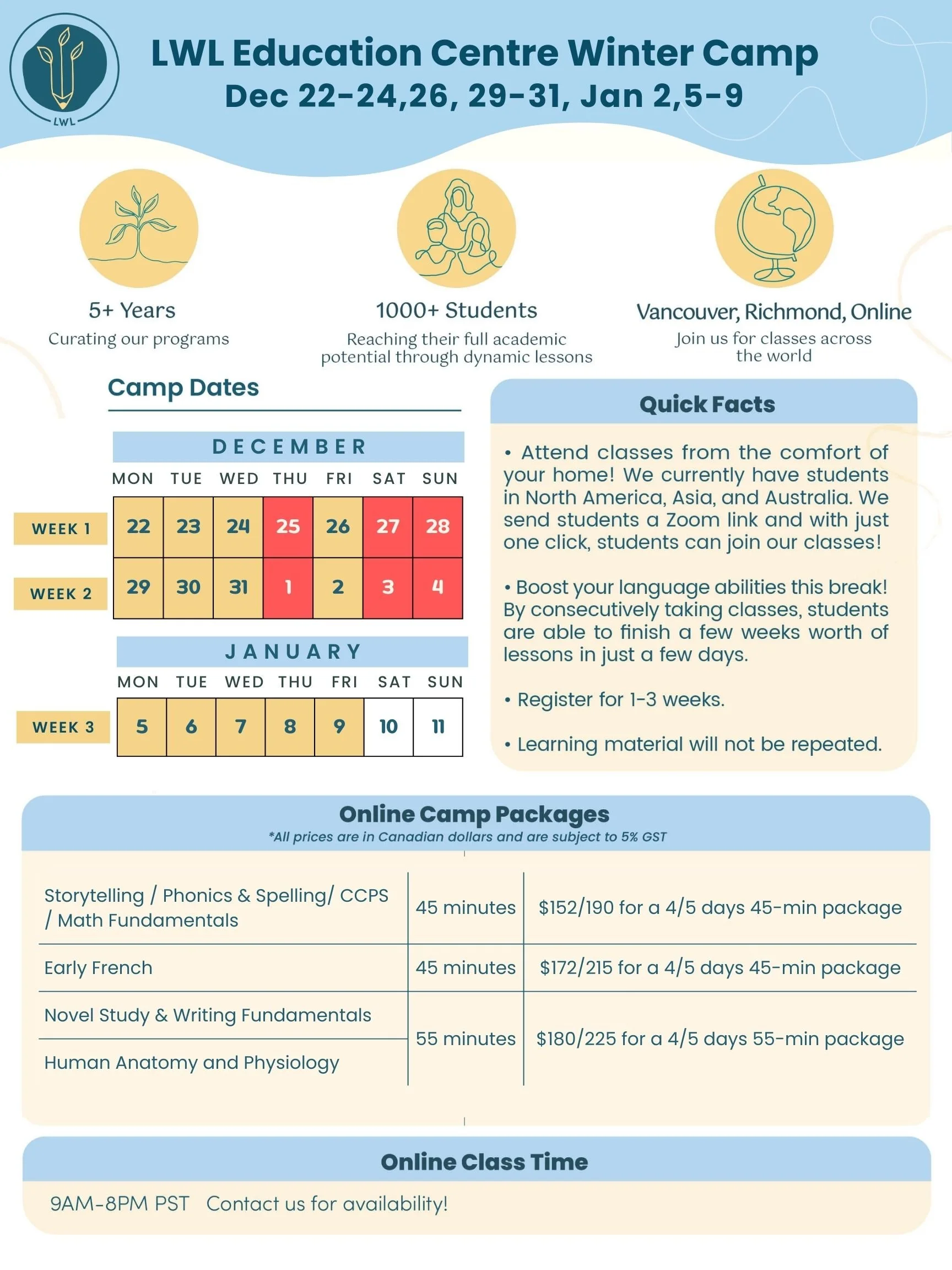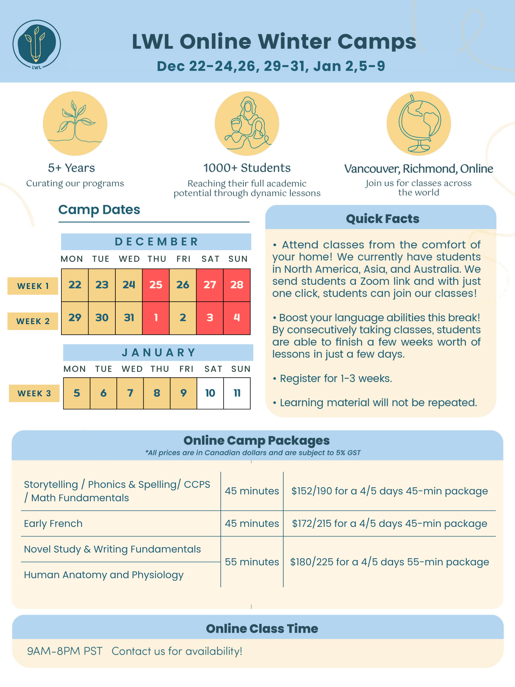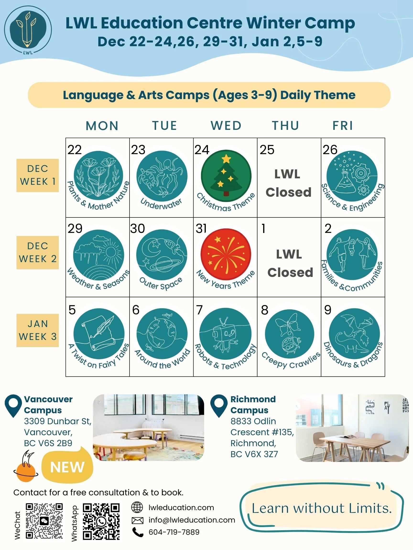 Registration: Register via our scheduler below or WhatsApp/WeChat/email the LWL Office to book! If you are registering through the scheduler, our LWL Office will give you a follow up call to gather details to ensure your child is in the correct age groups for camps.